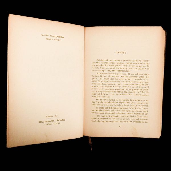 Tunç Yalman, Muhsin Ertuğrul, Özdemir Nutku, Adalet Ağaoğlu´na ait yazılar ve Türk tiyatrosu için belgesel tadında çok sayıda fotoğraf... Nahit Oralbi'ye hitaben kaleme alınmış ithaf ve imzanın sahibi belirlenemedi.