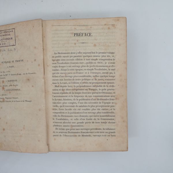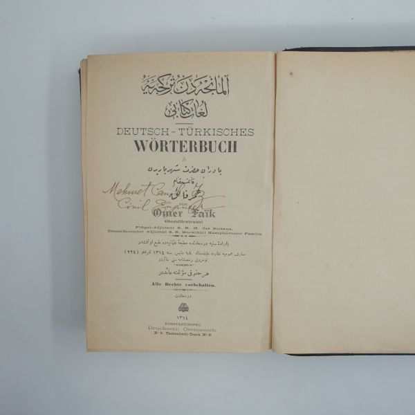 Mehmed Reşad´ın yaveri Kaymakam Ömer Lütfi Efendi tarafından kaleme alınmış Almanca´dan Türkçe´ye sözlüktür. Sözlükte İnşaat Mühendisi Mehmed Cemil İz´in exlibrisi yer almaktadır. *Sırtı ciltten kısmen ayrılmıştır.