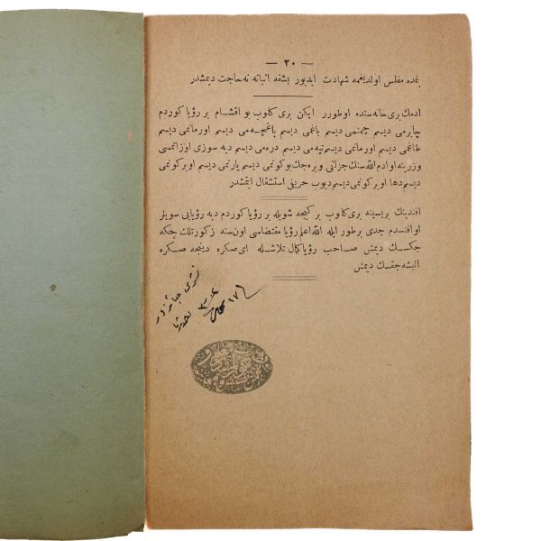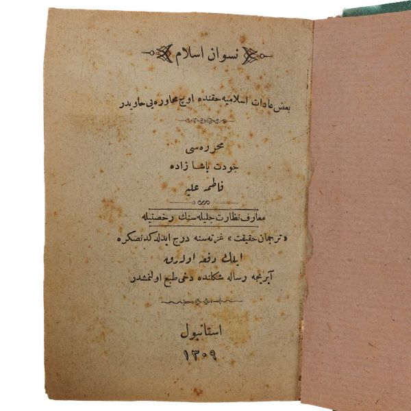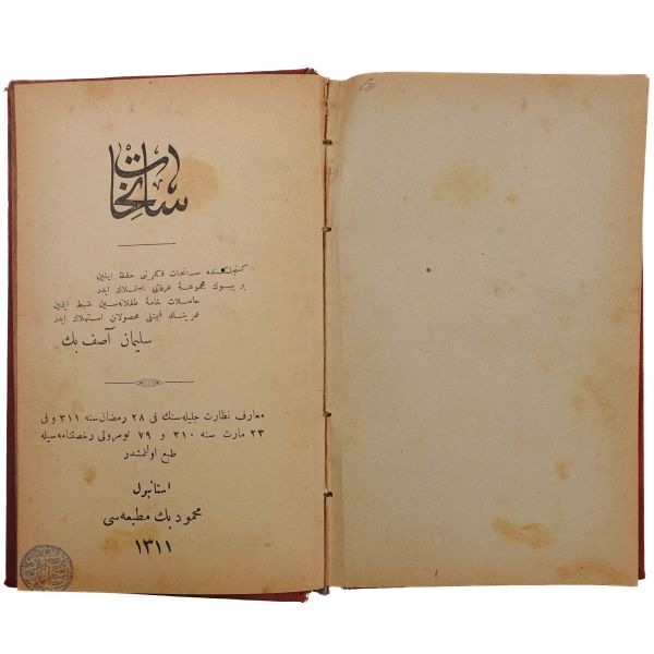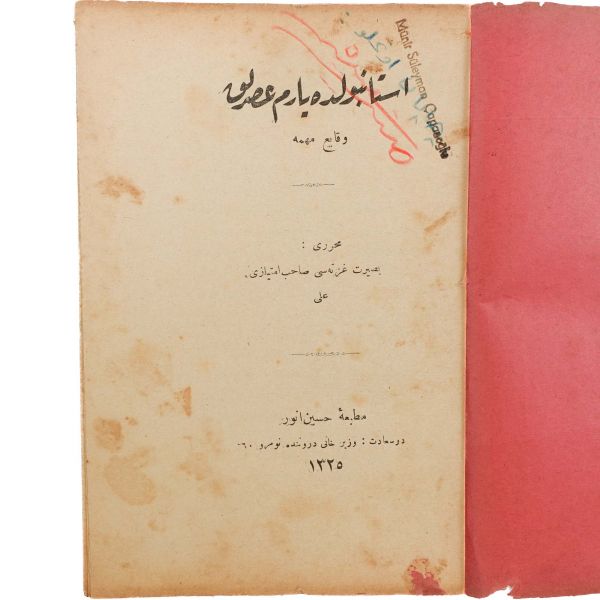 Satışa sunduğumuz eser, Sultan İkinci Abdülhamid devrinde kurulan ve gazete, dergi, kitap gibi basılı yayın unsurlarını teftiş etmek ve gerektiği durumlarda sansür uygulamak yetkisine sahip Encümen-i Teftiş ve Muayene Kurulu tarafından, "Neşri caizdir. 17 Muharrem 1306" notu ve "Maarif Nezareti Encümen-i Teftiş ve Muayene - Görülmüştür" yazısıyla mühürlenmiştir. *Sırtı aslına uygun kâğıtla güçlendirilmiştir.