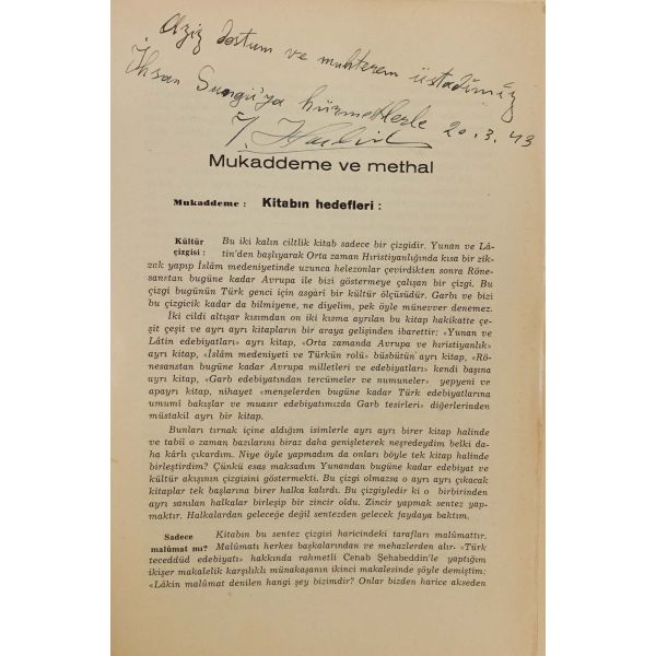 "Aziz dostum ve muhterem üstadımız İhsan ... hürmetlerimle" ithafıyla 20 Mart 1943 tarihinde imzalanmıştır.