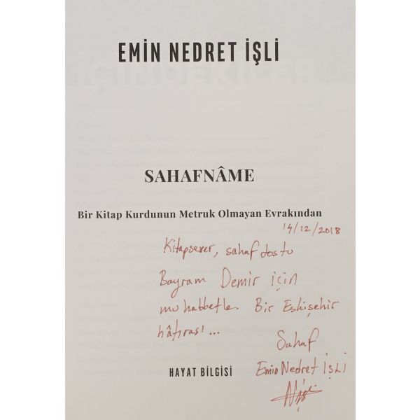 "Kitapsever, sahaf dostu Bayram Demir için mıhabbetle. Bir Eskişehir hatırası..." ithafıyla 14 Aralık 2018 tarihinde imzalanmıştır.