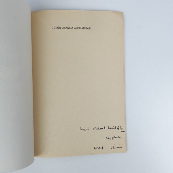 "Aziz Kardeşim Muzaffer Atabayır´a en iyi dilek ve sevgilerimle." ithafıyla, 28 Şubat 1966 tarihinde imzalanmıştır. *Bazı sayfalar sırttan ayrılmıştır.