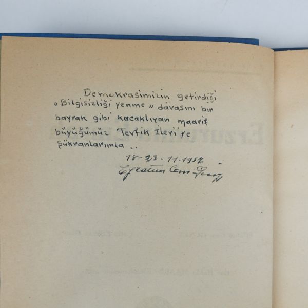 "Demokrasimizin getirdiği ´Bilgisizliği Yenme´ dâvasını bir bayrak gibi kucaklıyan maarif büyüğümüz Tevfik İleri´ye şükranlarımla." ithafıyla, 18 Kasım 1957 tarihinde imzalanmıştır.