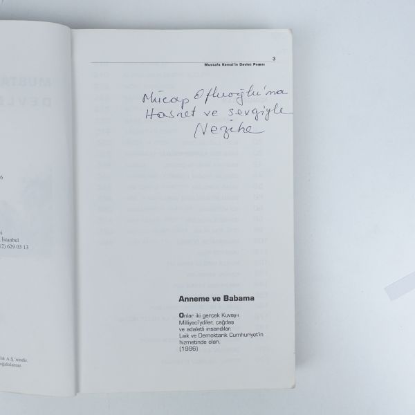 Çifte imzalı kitabın ilk sayfası "Selam Olsun", ikinci sayfası ise "Mücap Ofluoğlu´na hasret ve sevgiyle." ithafıyla imzalanmıştır. *Son sayfadaki Atatürk fotoğrafı kesilerek çıkarılmıştır.