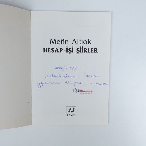 "Sevgili Ayşe, mutlulukların hesabını yapamamanı diliyoruz." ithafıyla, 1 Nisan 2000 tarihinde imzalanmıştır. *İmzanın tam üzeri bir etiketle kapatılmıştır.