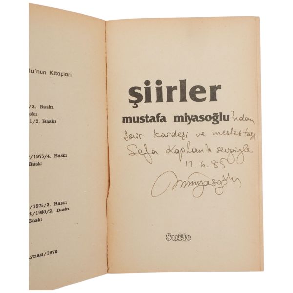 "Mustafa Miyasoğlu´ndan şair kardeşi ve meslektaşı Sefa Kaplan´a sevgiyle" ithafıyla 12 Haziran 1985 tarihinde imzalanmıştır.