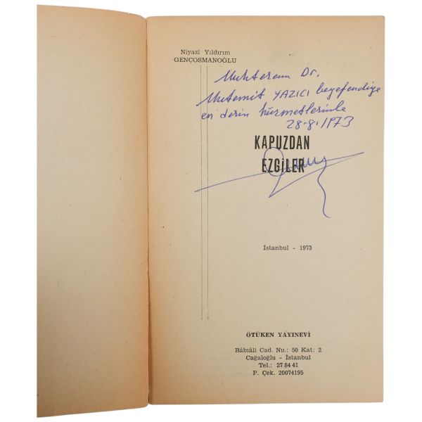 "Çok değerli dostum Orhan Bey´e sevgi ve en iyi dileklerimle" ithafıyla 4 Nisan 1972 tarihinde imzalanmıştır.