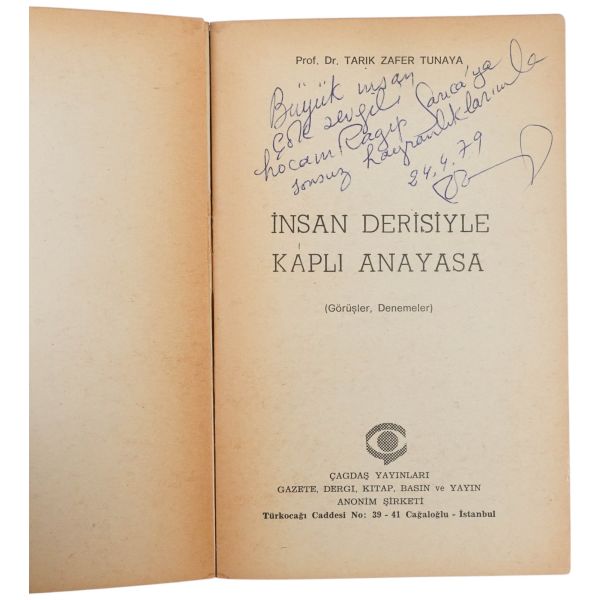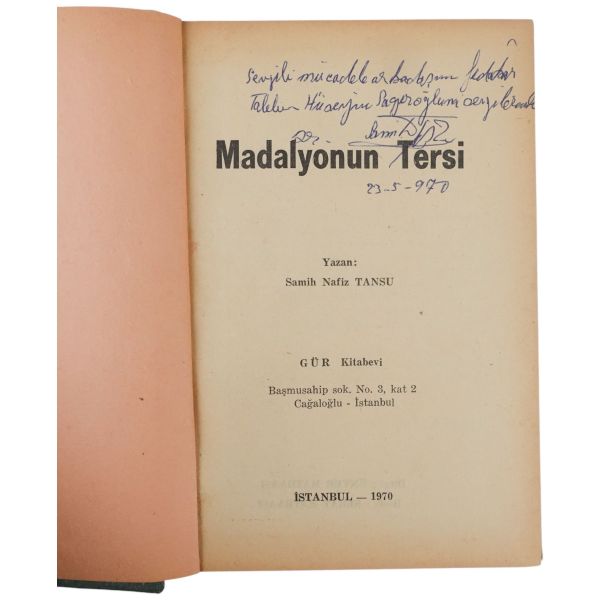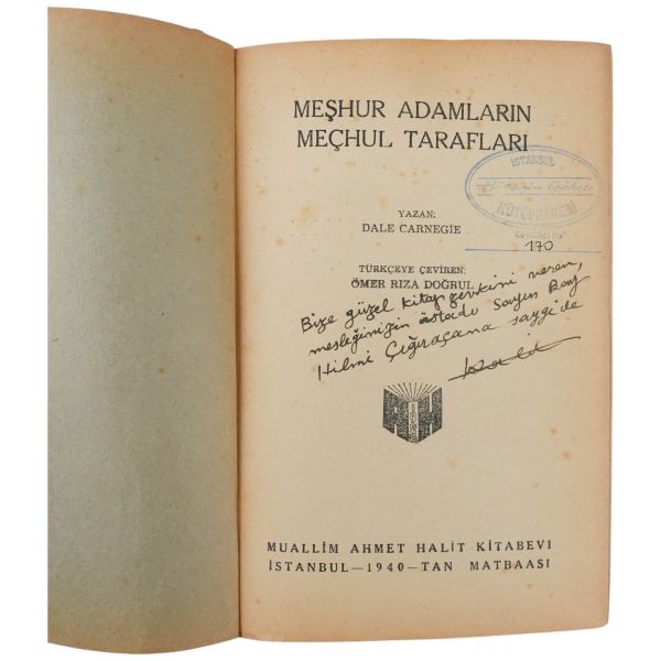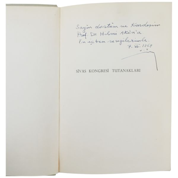 "Sayın dostum ve Kardeşim Prof. Dr. Hilmi Akın´a en içten sevgilerimle." ithafıyla, 7 Haziran 1969 tarihinde imzalanmıştır. *Bazı satırların altı kurşunkalemle çizilmiş veya kenarları işaretlenmiştir.