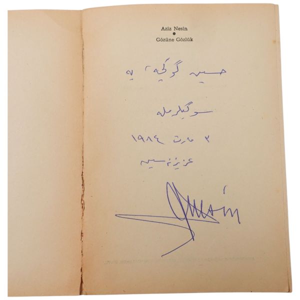 Aziz Nesin´in Osmanlıca "Hüseyin Gökçe´ye sevgilerimle" şeklinde kaleme aldığı Osmanlıca ithafı ve imzasıyla... Kitabın künye sayfasından sonraki sayfada, Aziz Nesin´in "Hal" isimli şiiri damga olarak basılmıştır.