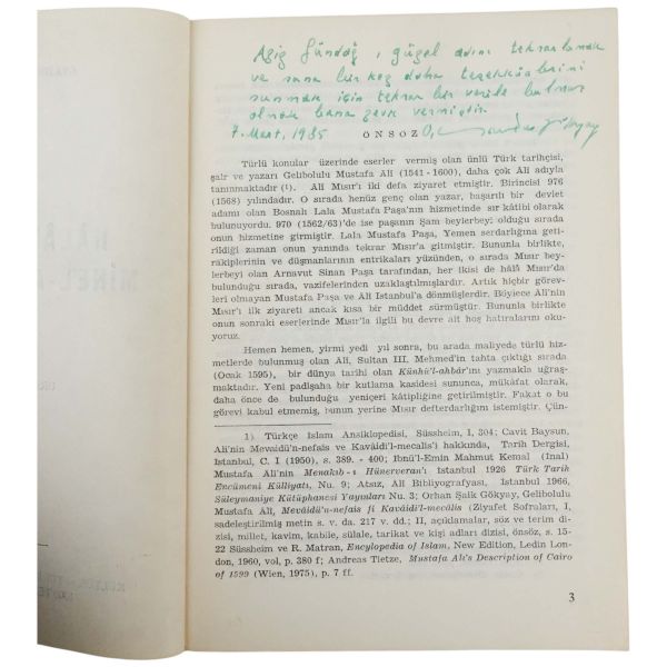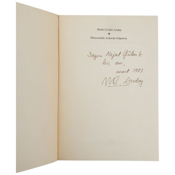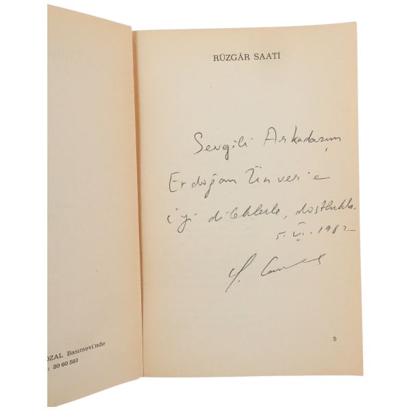 "Aziz Gündağ, güzel adını tekrarlamak ve sana bir kez daha teşekkürlerimi sunmak için tekrar bir vesile bulmuş olmak bana zevk vermiştir." ithafıyla 7 Mart 1985 tarihinde imzalanmıştır.