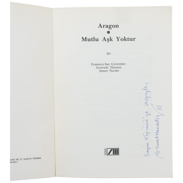 "Burak Dürüs için edebiyatın dostluğuna duyulan güvenle" ithafıyla 4 Mart 1983 tarihinde imzalanmıştır.