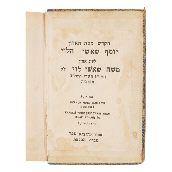 Kapak İçinde Kitabın Merhum Moshe Saşo Levi Ruhuna Kardeşi Yusuf Saşo Tarafından 3/10/1974 Tarihinde İthaf Edildiği Yazılı Etiket Yapıştırılmıştır. Haham Rashi ve Onkalus Yorumlu ve Değerli Hahamları İzahatleri ve Haftarah İçerir. Karton cildinde