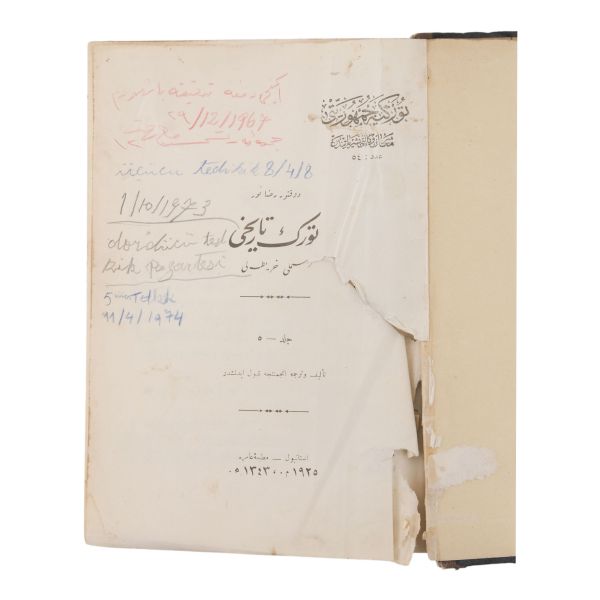 Dr. Rıza Nur´un opus magnumu "Türk Tarihi"nin farklı baskılardan 5 cildi. Türk tarihi çalışamalarında hâlâ temel referans kitaplarından olma vasfını koruyan bu kanonik çalışma Türk tarihinin farklı devirlerine ait bolca harita ve resim de içerir. Not alınarak ve satır altları renkli kurşun kalemle ve siyah tükenmez kalemle çizilerek okunmuştur.