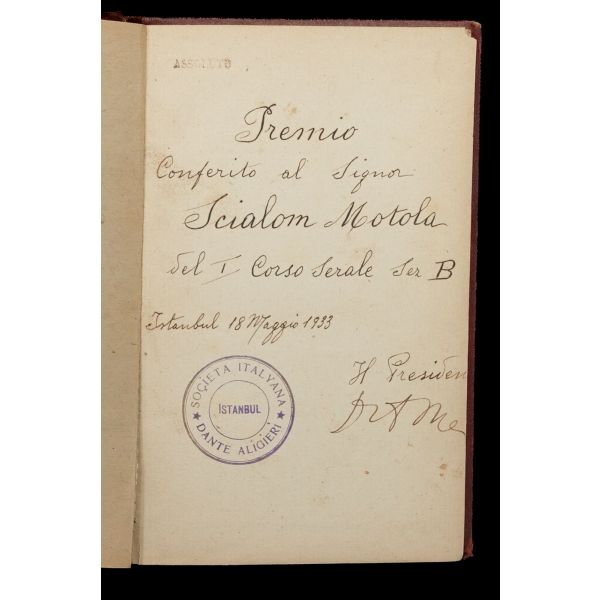 "Soçieta İtalyana Dante Aligieri İstanbul" mühürlü ve 1933 tarihli italyanca bir yazı ve yazara ait olmayan imza...