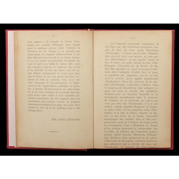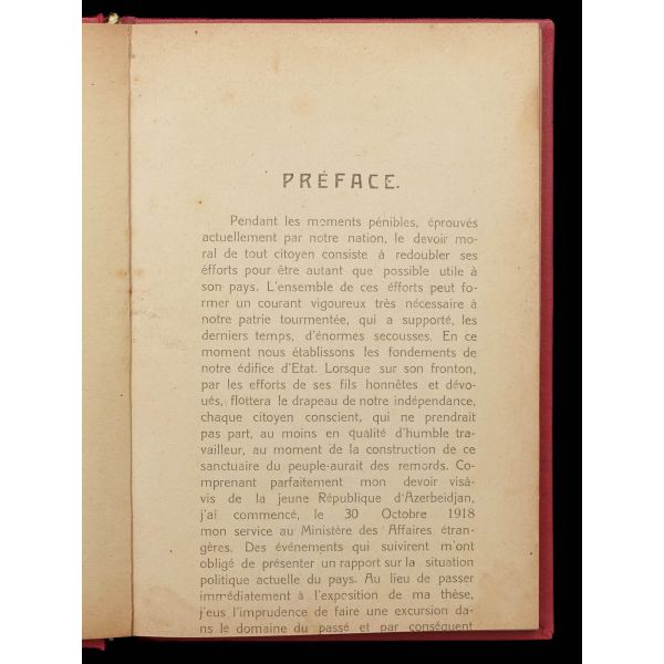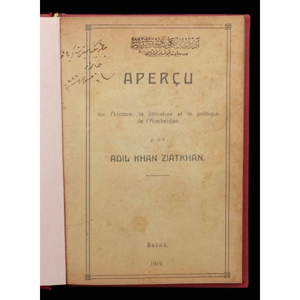 "Baytar Binbaşı Şakir Bey Efendi´ye hatıra" 2 Ağustos 1922 tarihli imzasız bir ithaf yer almaktadır. Azerbaycan´ın tarihi, edebiyatı ve siyaseti hakkında bir inceleme.