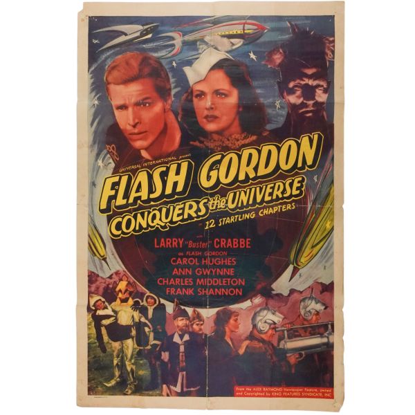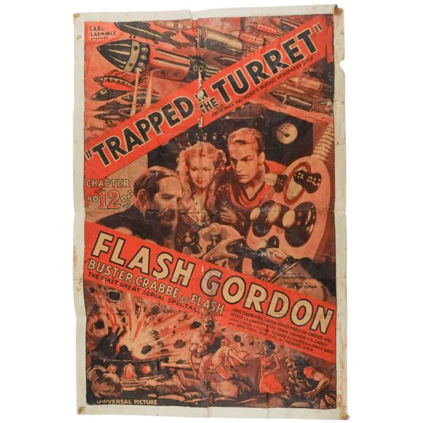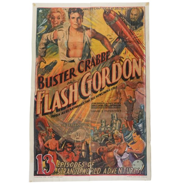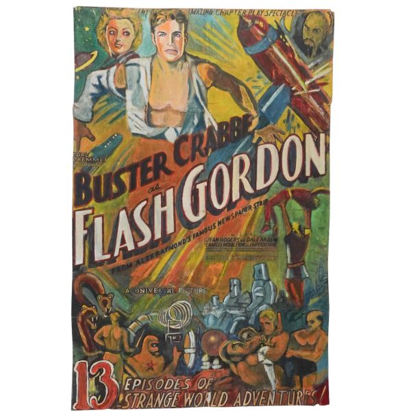 1936 yapımı Flash Godon Buster Crabbe filminin, guaj boya ve kolaj tekniğiyle yapılmış, el yapımı orijinal afişi... *Kat yerlerinde ve köşelerinde yıpranmalar ve tamirler mevcuttur.