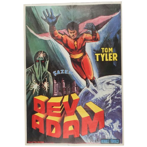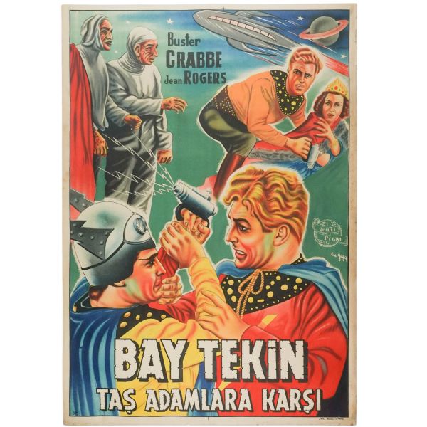 Türkçeye "Bay Tekin" adıyla çevrilen bir Flash Gordon filminin afişi... Arkasında 28 Mayıs 1958 tarihine ait "Bay Reklamcı, Sinemanızda geçecek olan seriallerin afişlerindendir lütfen reklam yapılması rica B.SEKBANLARDA, BURSA" notu kaleme alınmıştır.