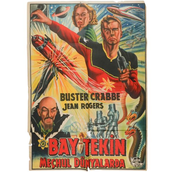 Türkçeye "Bay Tekin" adıyla aktarılan Flash Gordon'ın Buster Crabbe filminin, guaj boya ve kolaj tekniğiyle yapılmış, orijinal afişi... *Afişte tamirler ve yıpranmalar mevcuttur.