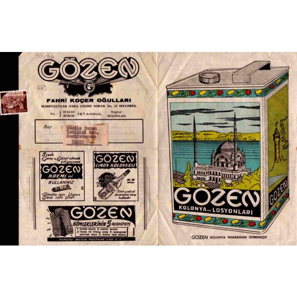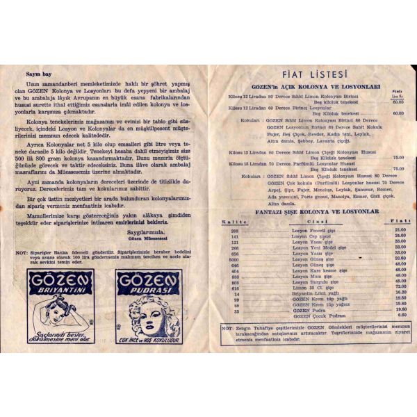 "Sayın Bay, Uzun zamandan beri memleketimizde haklı bir şöhret yapmış olan GÖZEN Kolonya ve Losyonları bu defa yepyeni bir ambalaj ve bu ambalaja lâyık Avrupanın en büyük esans fabrikalarından hususi surette ithal ettiğimiz esanslarla imâl edilen kolonya ve losyonlarla karşınıza çıkmaktadır. Kolonya tenekelerimiz mağazanızı ve evinizi bir tablo gibi süsliyecek, içindeki Losyon ve Kolonyalar da en müşkülpesent müşterilerinizi memnun edecek kalitededir. (...) Mamullerimize karşı göstereceğiniz yakın alâkaya şimdiden teşekkür eder siparişlerinize intizaren emirlerinizi bekleriz. Saygılarımızla. Gözen Müessesesi"