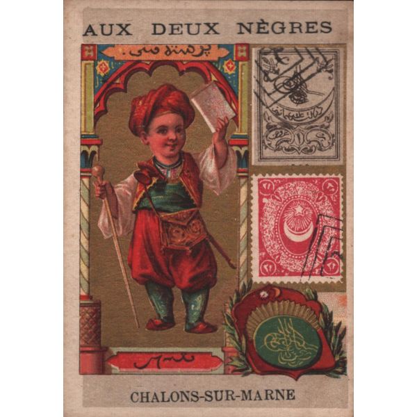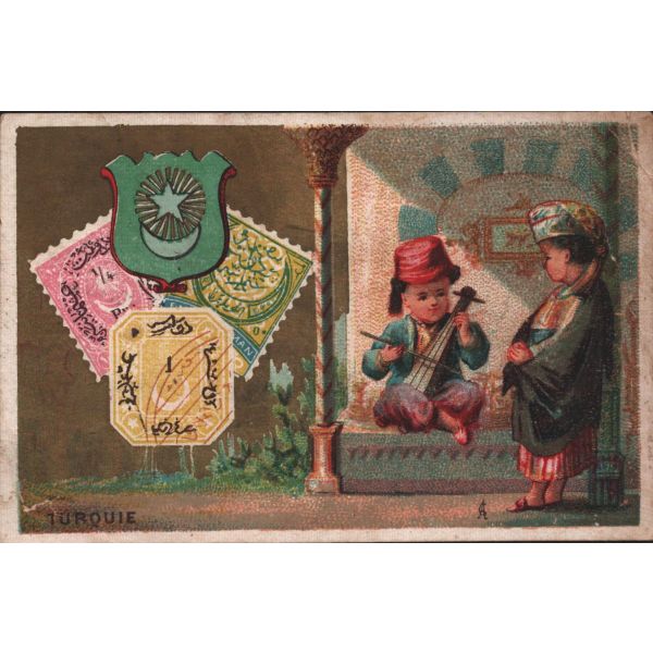 Farklı ülkelerden kostümler giymiş cocuklar kromolitograflı ticaret kartı.