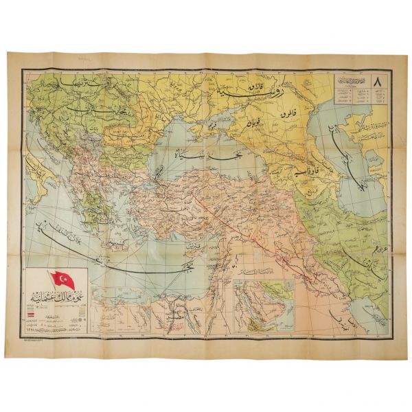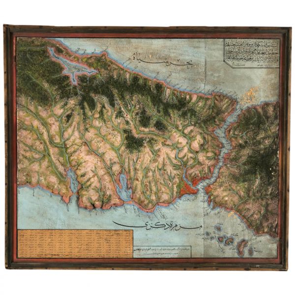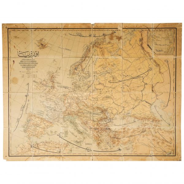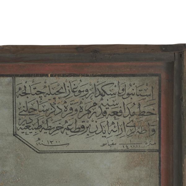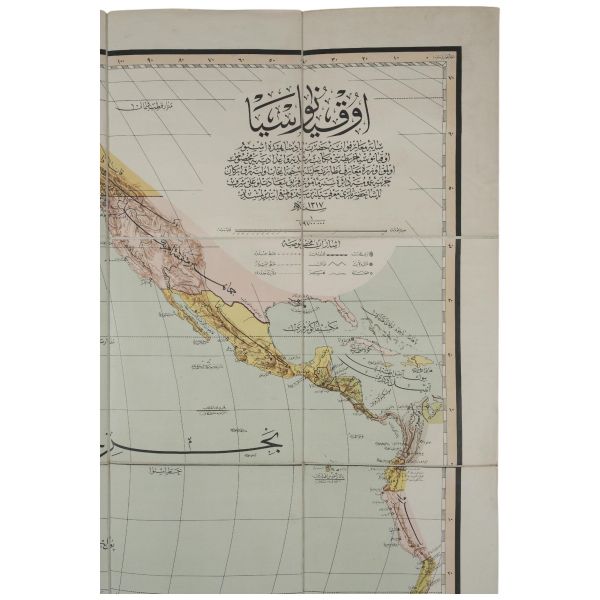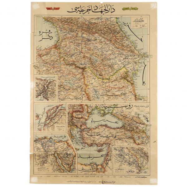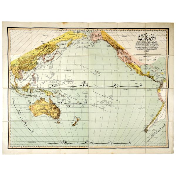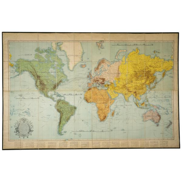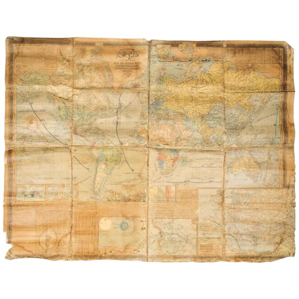 Asya, Avrupa, Afrika, Avusturalya kıtalarıyla kutupların ve enlemlerle boylamların gösterildiği harita... Altta Osmanlı arması tarzında gözlem ve ölçüm aletleri çizilmiştir.