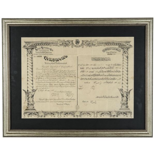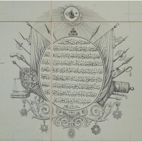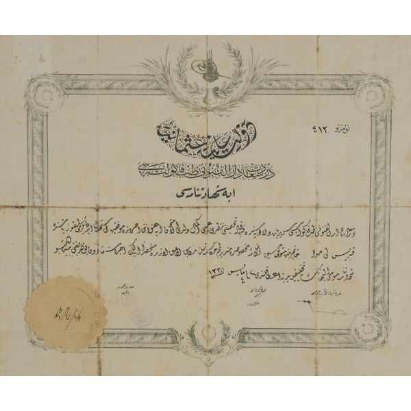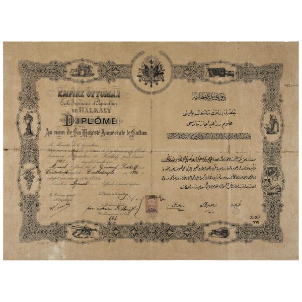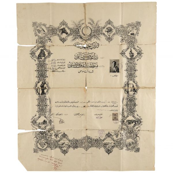 Sultan İkinci Abdülhamid tarafından kurulan ve Cumhuriyet döneminde de misyonunu devam ettiren mektebin diplomasında dönemin iktisat vekili Mustafa Rahmi Köken´in ıslak imzası yer almaktadır. *Kat yerlerinden yırtılmış ve tamir görmüştür.