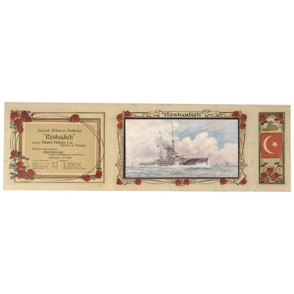 Osmanlı´nın I. Dünya Savaşı öncesinde donanmadaki eksikliğini gidermek amacıyla, İngiliz menşeli Vickers fimasına imal ettirdiği Reşadiye Zırhlısı´nın tanıtım broşürün kapağında, ay yıldız ve Latin harfleriyle "RESHADIEH" yazısı yer almaktadır. İç sayfaların ilkinde İngilizce üretici firma, gemiye ismini veren Tevfik Paşa´nın kızı Naile Hanım´ın ismi ve teknik bilgileri yazılıdır. Broşürün tam ortasında ise Reşadiye Zırhlısı´nın Türk bayrakları ile süslenmiş bir çizimine yer verilmiştir.