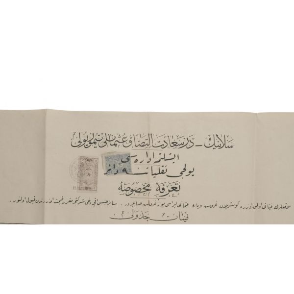 Selanik-Dersaadet (İstanbul) İltisak-ı Osmanlı Demiryolu hattının mührünü taşıyan tarifede, hat boyunca uğranan istasyonların isimleri de tek tek yazılmıştır.