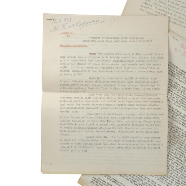 Ali Fuat Cebesoy, Mustafa Kemal Atatürk´ün harp okulundan arkadaşı ve Milli Mücadele yıllarında, Cumhuriyet´in kuruluşunda silah arkadaşıdır. Müzayedemizde sunduğumuz evrakı içinde, muhtemelen hatıralarını yayımlamaya hazırlandığı bir dönemde daktilo ile yazdığı ve her bir nüshasını imzaladığı "Atatürk, İkinci Meşrutiyetten evvel Misak-ı Milli´nin esaslarını nasıl düşünmüş ve kararlaştırılması için nasıl çalışmıştı?", "Atatürk´ün yüksek kumandanlık ve meziyetleri", "Komünist Enternasyonal İcra-i Komitesi´nin Türkiye´de mesai tarzı hakkındaki tezleri" başlıklı yazıları yer almaktadır. Ayrıca dayısı olduğu Nazım Hikmet Nazım Hikmet hakkındaki görüşlerini dile getirdiği 4 sayfalık bir metin ve muhtelif Divan şairlerinden derlediği şiir defterleri de bu evraka dâhildir.