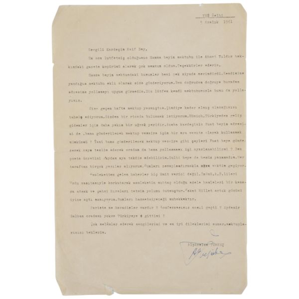Mektubuna, Raif Bey´den kendisine gelecek mektupların varış adresini koordine etmesini rica ederek başlayan Türkeş, mektubun devamında memleketin siyasi karmaşıklığını ifade eden şu gelişmeleri bildiriyor: "Memleketten gelen haberler hiç ümit verici değil. İnönü, AP'lileri Ordu vasıtasıyle korkutarak memleketin muhtaç olduğu acele hamleleri bir kenara atmak ve şahsi hırsları tatmin yolunu tutmuştur. Fakat Millet artık gözünü iyice açtı sanıyorum. Bunları hazzetmiyeceği muhakkaktır."