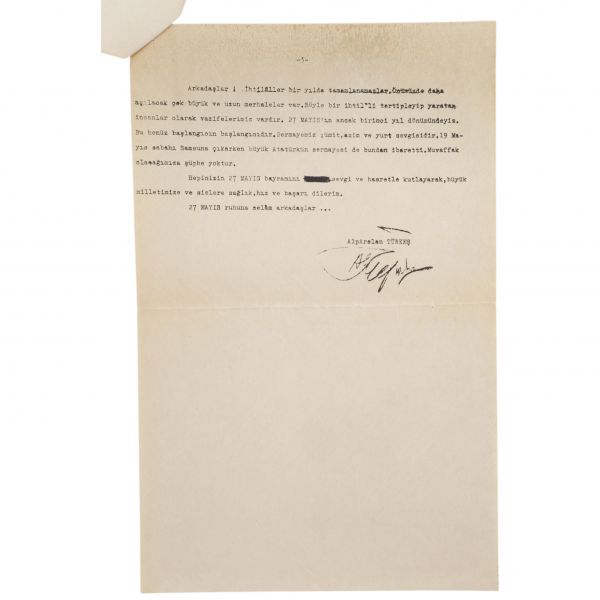 12 Eylül 1961 tarihli mektup sureti, "Muhterem Selim Beyefendi" hitabıyla başlamaktadır. Mektupta, sabık iktidar mensuplarının infaz cezalarının hafifletilmesi ve ihtilalin ilk günlerinde kararlaştırıldığı gibi İsviçre´ye gönderilmeleri tavsiye edilmiş, aksi takdirde memleketin iç huzursuzluğunun artacağına dikkat çekilmiştir. "Kutlama" başlıklı metin ise, Türkeş´in "Ak İhtilal" olarak nitelendirdiği 27 Mayıs İhtilali´nin birinci yıldönümü vesilesiyle kaleme alınmış, ana hatlarıyla ihtilalin gerek ve yararları ifade edilmiştir.