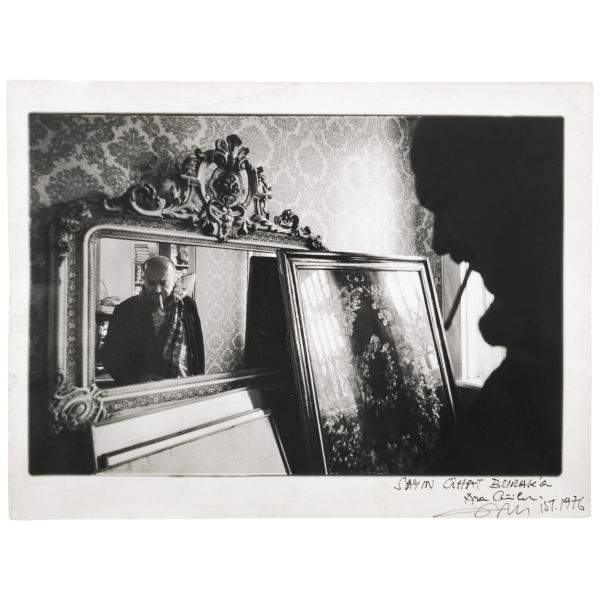 1976 yılında çekilen fotoğrafın ön yüzü Ara Güler tarafından "Sayın Cihat Burak'a" ithafıyla imzalanmıştır. Fotoğrafın arka yüzünde "Photographed by Ara Güler" kaşesi yer almaktadır...