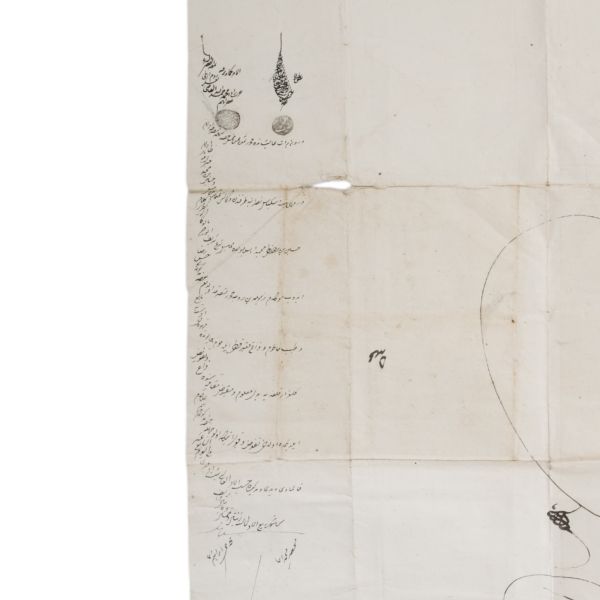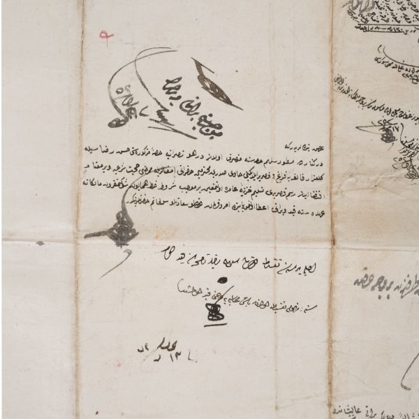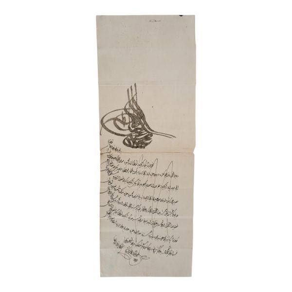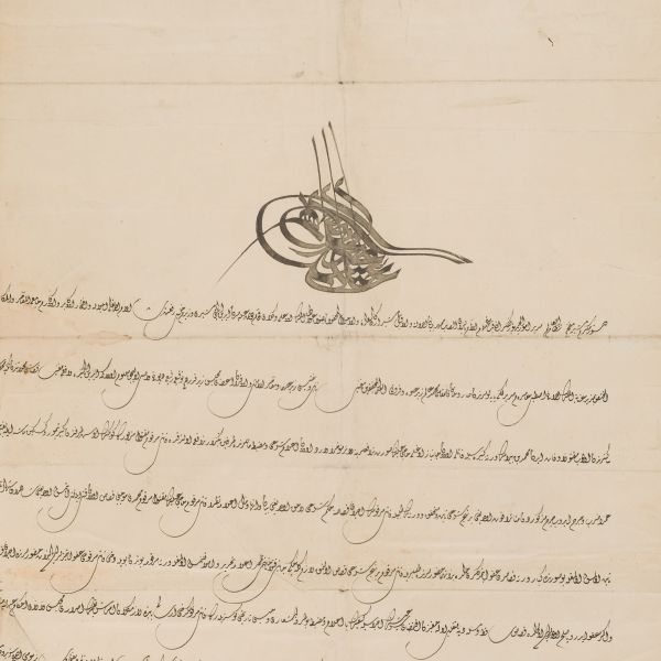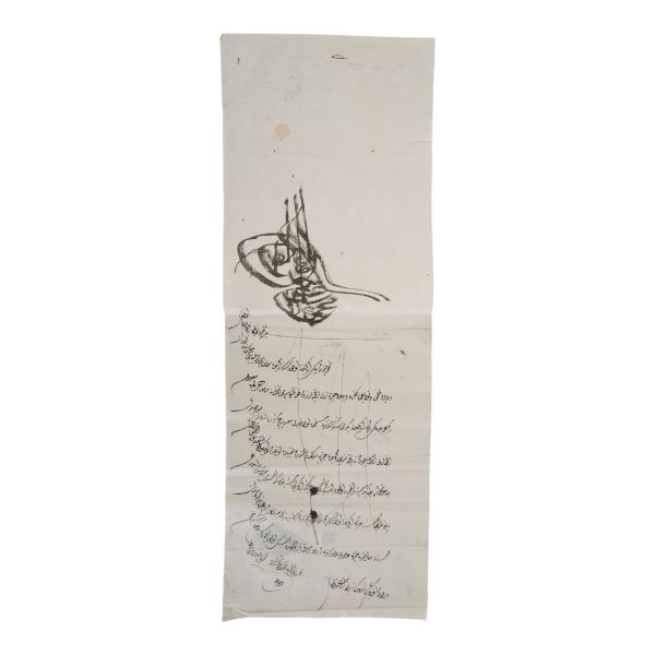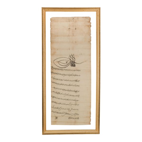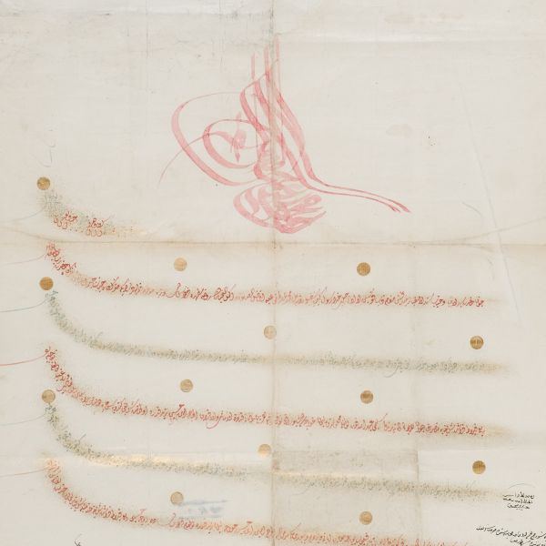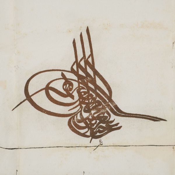 Katırcıoğlu Kapıcı Sökyas kızı Diruhi adlı gayrimüslim kadının tasarrufunda iken Harem-i Hümâyun´da Gülizar Kalfa´ya verilen mukataa hissesinin fermanı. İstanbul ve Tevâbii Emtia Gümrüğü Mukataasının beşte birinin sekizde birinin hissesinin kadın ya da erkek, üç milletten (Müslüman, Hıristiyan, Musevî) talip olana satılmasına ve masraflarının sefer masraflarına tahsis edilerek Ordu-yı Hümâyuna harcanmasına dair ferman.