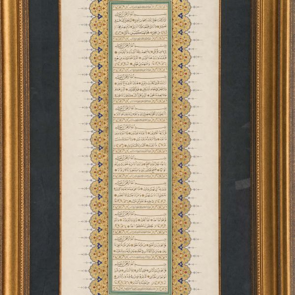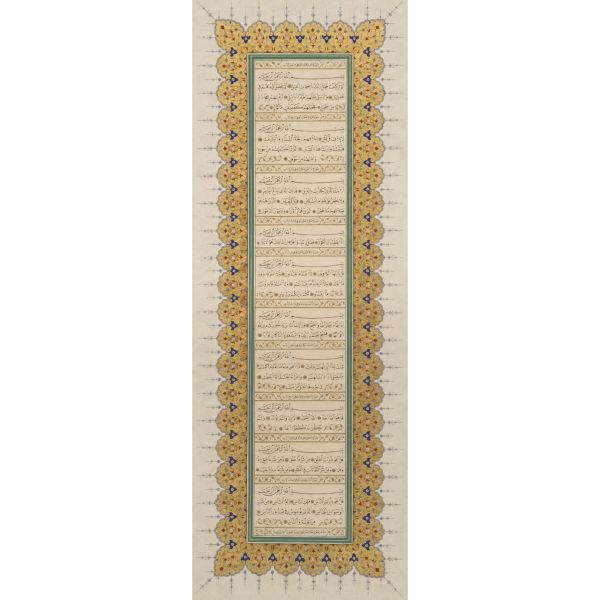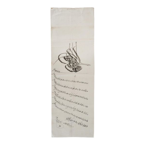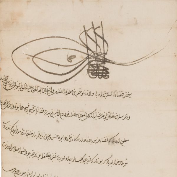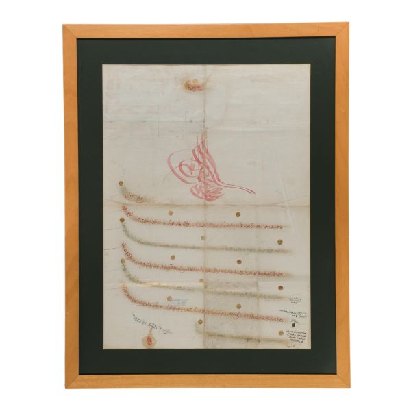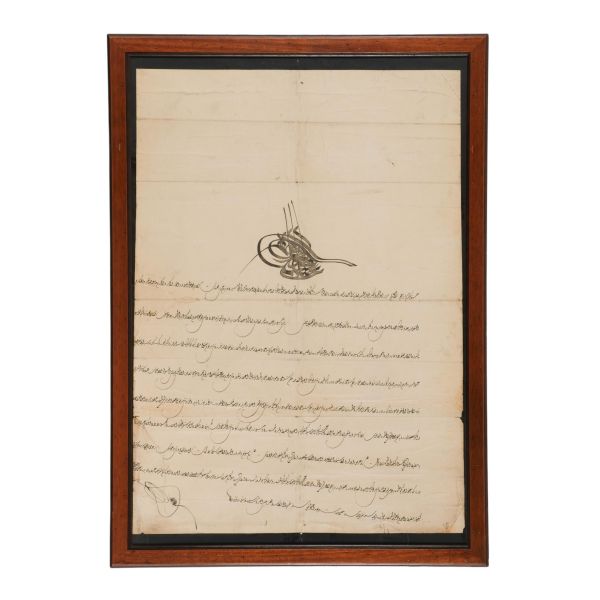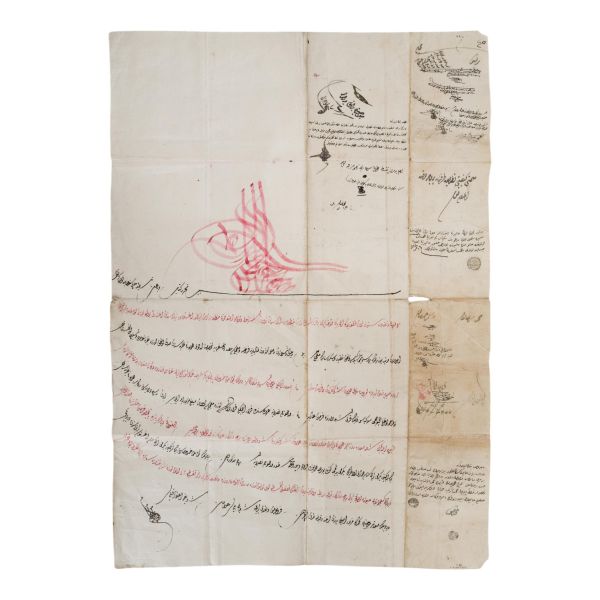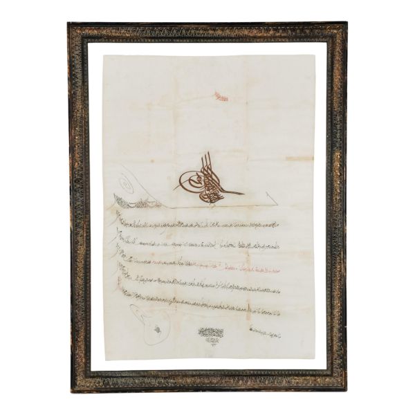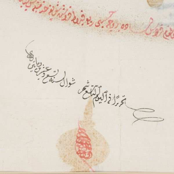 Katırcıoğlu Kapıcı Sökyas kızı Diruhi adlı gayrimüslim kadının tasarrufunda iken Harem-i Hümâyun´da Gülizar Kalfa´ya verilen mukataa hissesinin fermanı. İstanbul ve Tevâbii Emtia Gümrüğü Mukataasının beşte birinin sekizde birinin hissesinin kadın ya da erkek, üç milletten (Müslüman, Hıristiyan, Musevî) talip olana satılmasına ve masraflarının sefer masraflarına tahsis edilerek Ordu-yı Hümâyuna harcanmasına dair ferman.