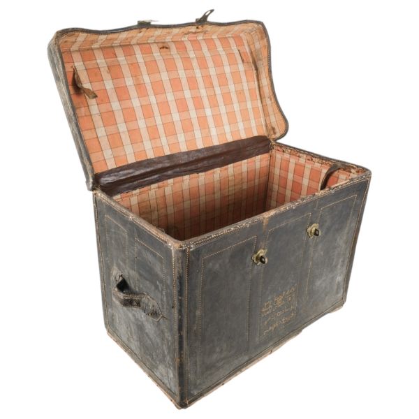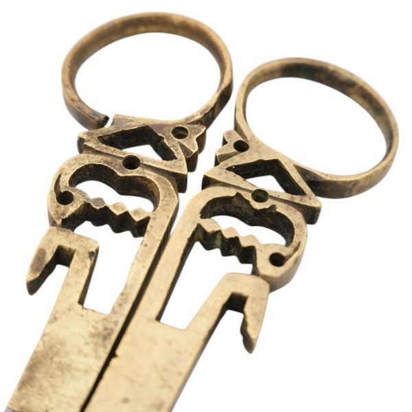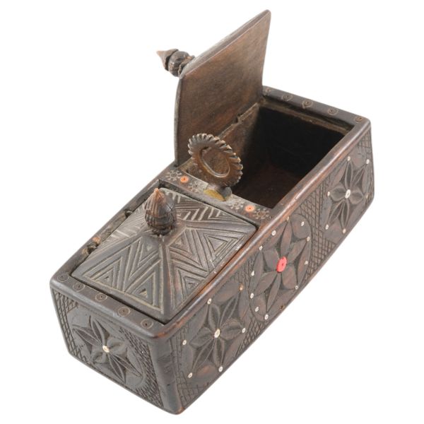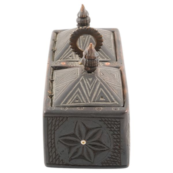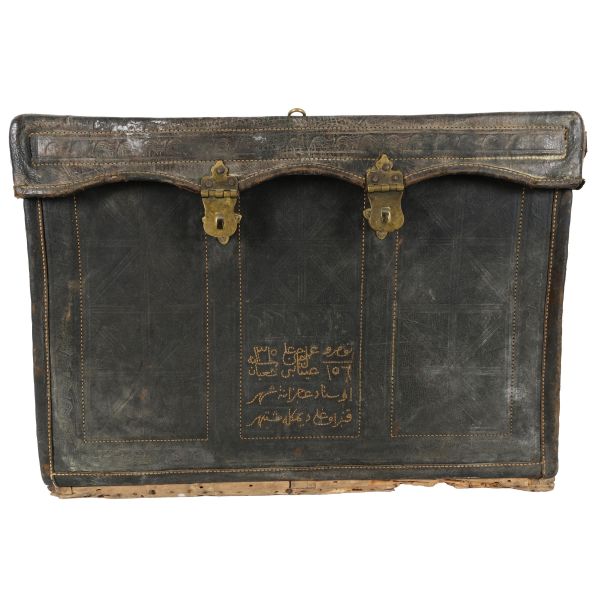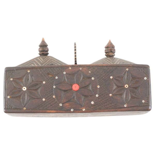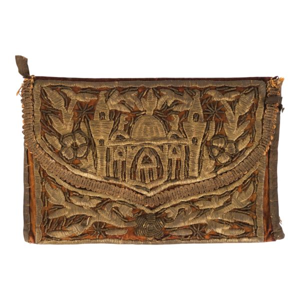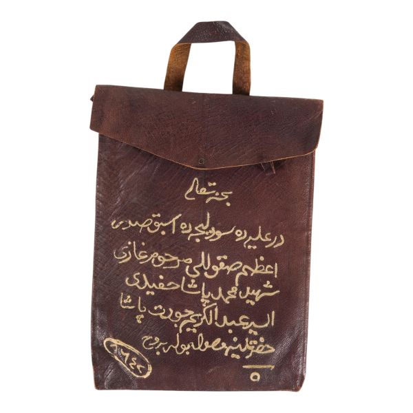 Motiflerle bezeli, yanlardan iki deri kulplu, tokalı ve arkadan iki deri kemerli.