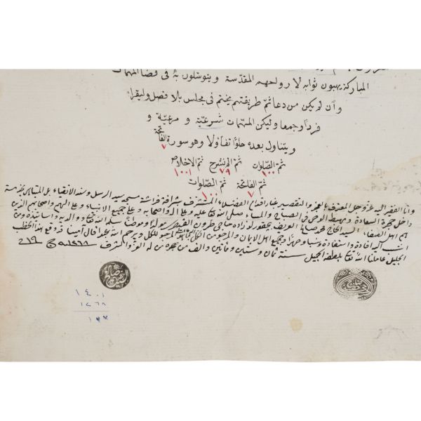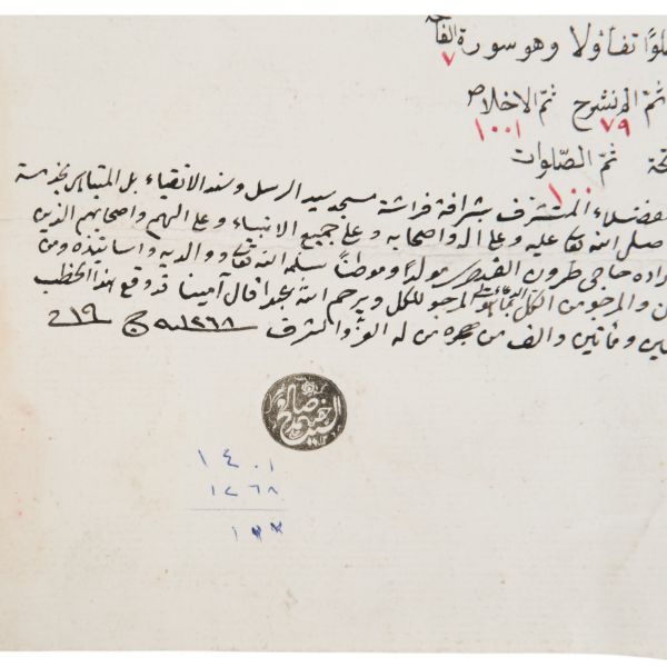 Mora yarımadasında yaşayan Seyid Zekeriya´nın vefâtı üzerine "dörtte bir kıratlık feraşet" görevine Hayriye tüccarlarından Balmumcuzade Seyyid Mehmed Tevfik´in eşinin getirilmesine dair feraşet beratı.