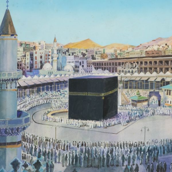 Gazete ve dergilerdeki illüstrasyonları, kitap ve dergi kapak tasarımlarıyla tanınan, Babıali'nin en üretken ve en yaratıcı çizerlerinden Münif Fehim'in Hayat mecmuası tarafından okurlarına verilen "Hac Günlerinde Kâbe" adlı afişin orijinal çizimi.