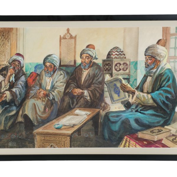 Gazete ve dergilerdeki illüstrasyonları, kitap ve dergi kapak tasarımlarıyla tanınan, Babıali'nin en üretken ve en yaratıcı çizerlerinden Münif Fehim'in, Süleyman Çelebi'nin 15. yüzyıl başlarında Hazreti Peygamber'i övmek ve üstünlüğünü anlatmak için yazdığı Vesiletü'n-Necât'ı ilk kez okuyuşunu tasvir ettiği sahne.