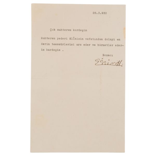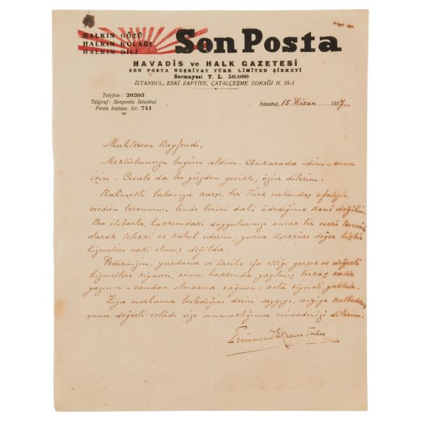 İhtifalci Mehmet Ziya Bey´in oğlu Celal Ergun´a Ercüment Ekrem Talu´dan imzalı yazı,