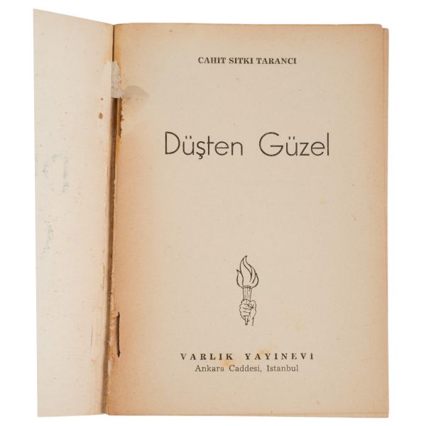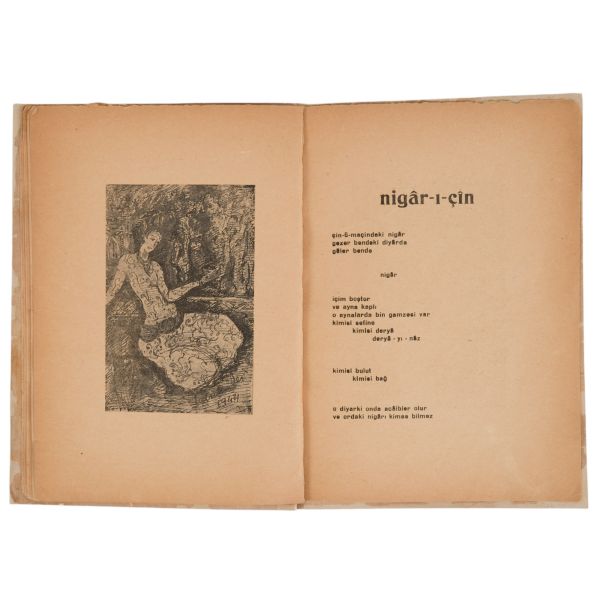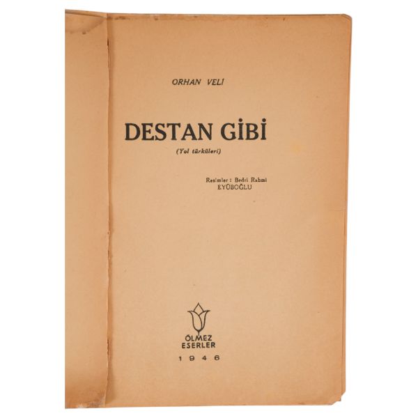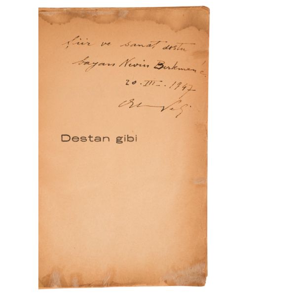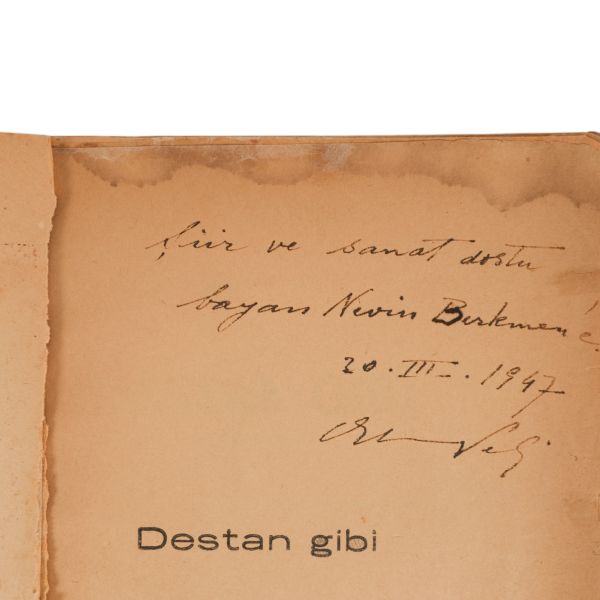 ve en önemli şairi olarak kabul edilen Orhan Veli´nin tek başına yayımladığı ikinci şiir kitabı... Bedri Rahmi'nın resimlediği bu kitabında Orhan Veli, özellikle bazı şiirleriyle Garip şiirinden uzaklaşarak daha özgün bir şiir kurma çabasının ipuçlarını verir. Eserin müzayedeye sunduğumuz bu kopyası, Orhan Veli tarafından "Sanat ve sanat dostu bayan Nevin Berkmen´e" ithafıyla, 20 Mart 1947 tarihinde imzalanmıştır. *Aslına uygun biçimde restore edilmiştir.