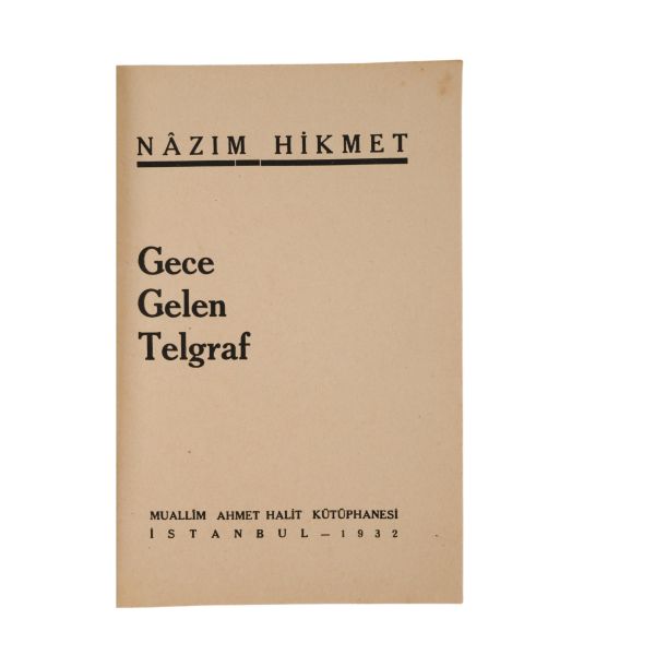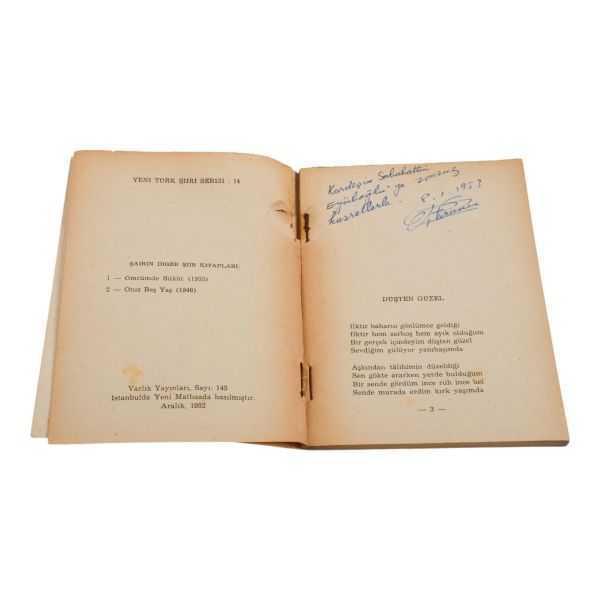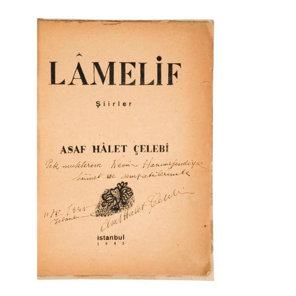 Cumhuriyet Dönemi Türk şiirinin en "nev'i şahsına münhasır" şairlerinden Asaf Halet Çelebi'nin ikinci şiir kitabı... Yalnızca 480 adet basılmış ve numaralanmış olan eserin bu kopyası "Pek muhterem Nevin Hanımefendi´ye hürmet ve sempatilerimle" ithafıyla, 11 Temmuz 1945 tarihinde imzalanmıştır. *Aslına uygun biçimde restore edilmiştir.