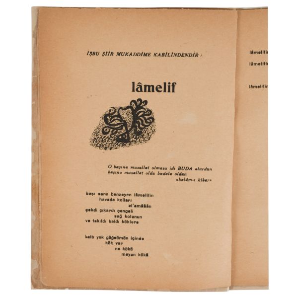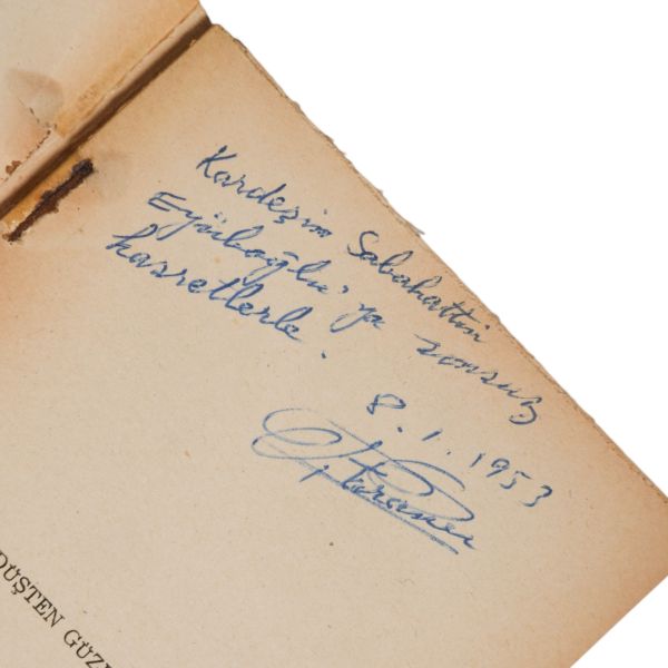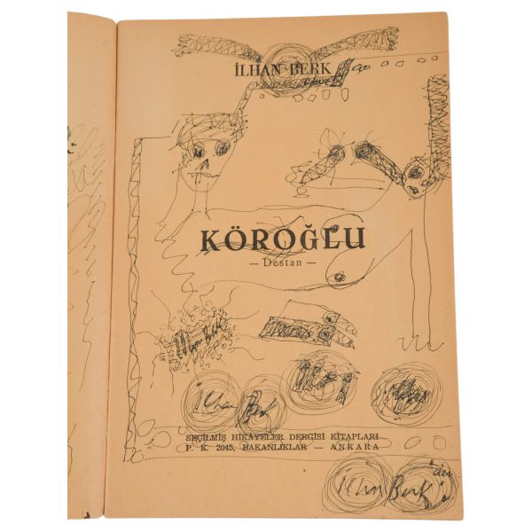 İlhan Berk´in, İkinci Yeni öncesinde yayımladığı beşinci şiir kitabı... Bu baskının ilk 10 adedi 1'den 10'a kadar numaralanmış ve satış dışı tutulmuştur. Müzayedemizde sunduğumuz nüsha, bu 10 adet kopya içinde şairin kendisi için ayırdığı, künye sayfalarını özgün desenleriyle süsleyerek kendisine ithaf ettiği 1 numaralı nüshadır.