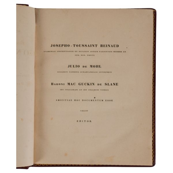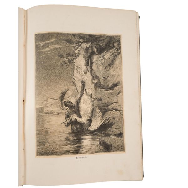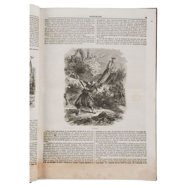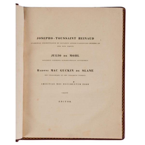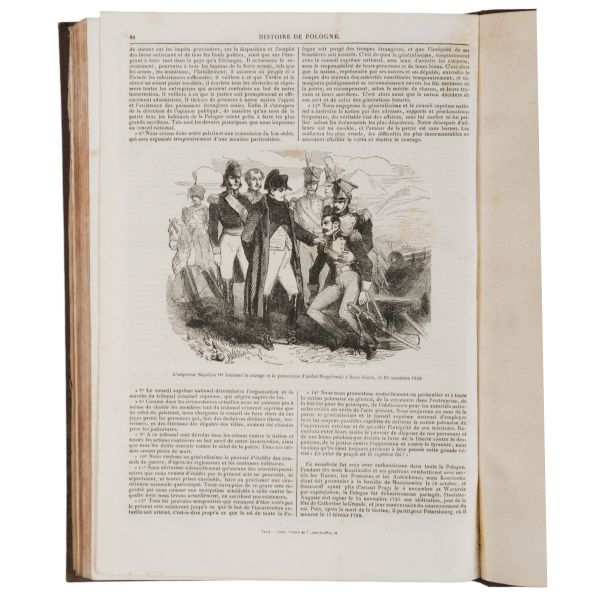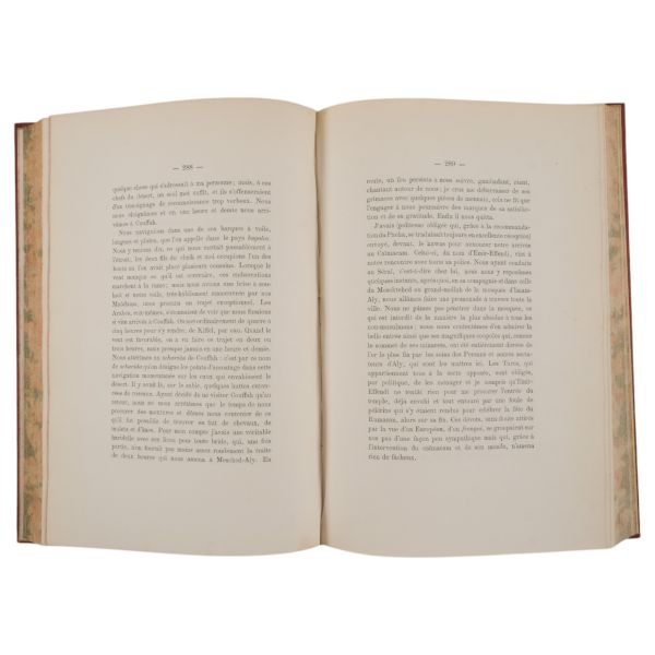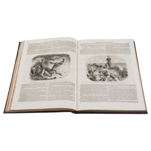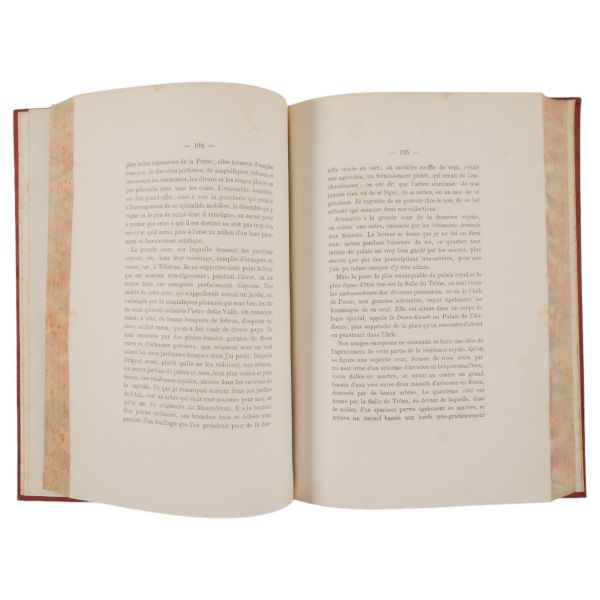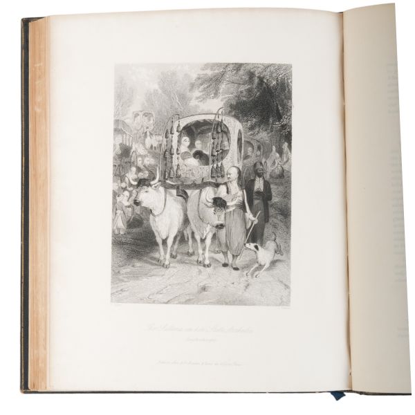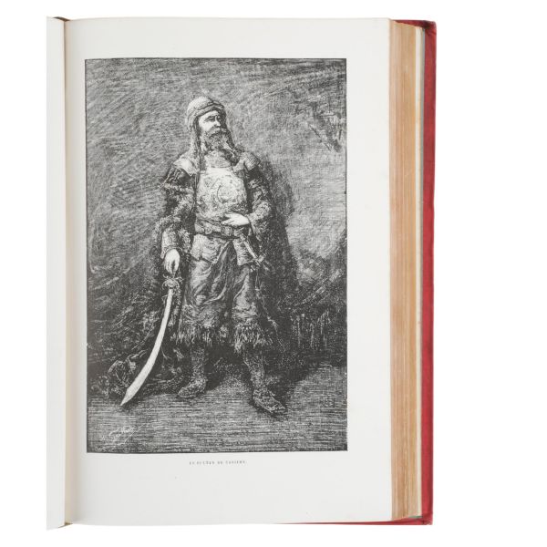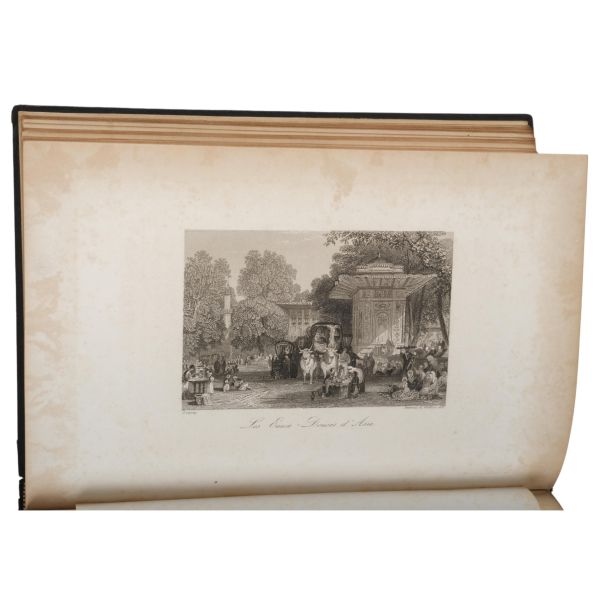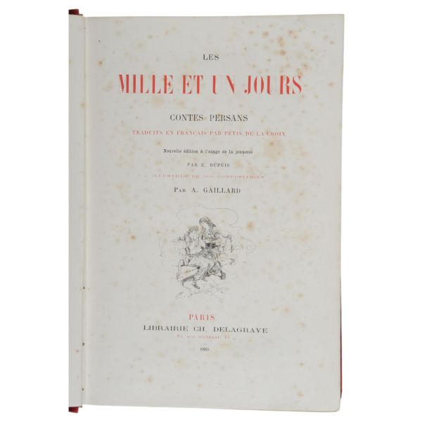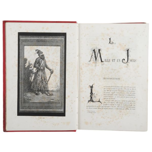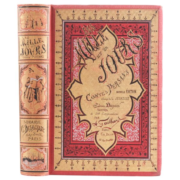 Suriye, İran ve Türkiye´de geçirdiği 10 yıl boyunca Arapça, Farsça ve Türkçe dillerine hakim olan Fransız oryantalist François Petis de la Croix´nın (1653-1713), Binbir Gece Masalları tarzında kaleme aldığı "Bin Bir Gün" isimli peri masalları derlemesi... Müzayedemizde sunduğumuz nüsha, ilk olarak 1710 - 1712 yılları arasında beş cilt halinde yayınlanan eserin, yayıncı E. Dupuis tarafından gençlerin kullanımına yönelik olarak hazırlanan 1855 tarihli baskısıdır. Masallara, A. Gaillard tarafından çizilen 500 adet çelik baskı illüstrasyon eşlik ediyor. Doğu ve Batı tarzı desenleri zarifçe buluşturan, yaldızlı, kabartmalı ve görkemli orijinal cildinde... Sayfa kenarları altın yaldızlıdır.