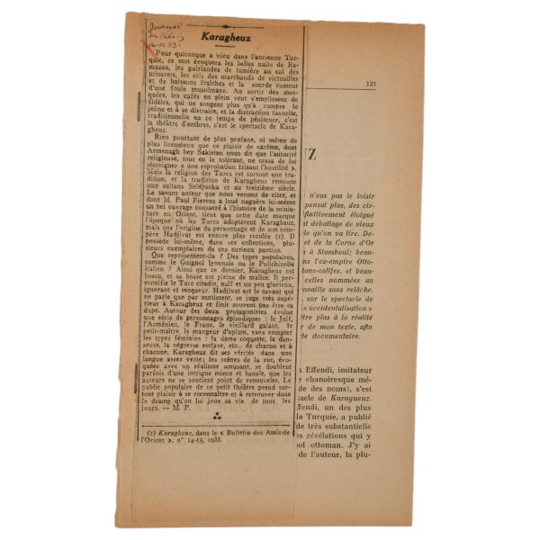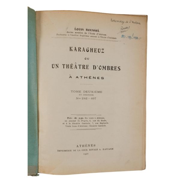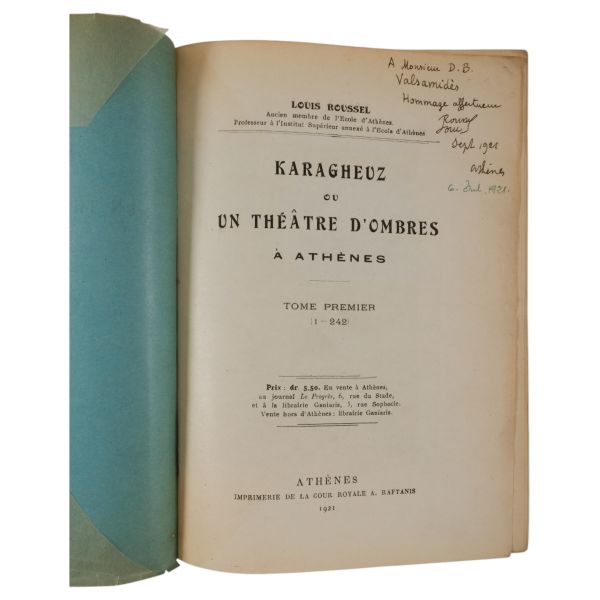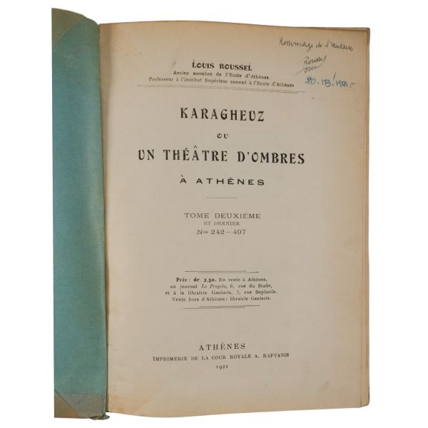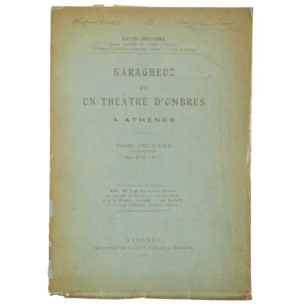 "Karagheuz ou un théâtre d’ombres à Athènes" (Karagöz ya da Atina’da Bir Gölge Tiyatrosu), Fransız yazar ve diplomat Louis Roussel tarafından yazılmış, iki ciltlik bir eserdir. Osmanlı ve Yunan kültürlerinde ortak bir halk tiyatrosu figürü olan Karagöz’ün Atina’daki versiyonunu detaylı biçimde inceler. Roussel, eserde Karagöz’ün kökenlerine, karakterlerine, sahne yapısına ve toplumsal rolüne ışık tutar; metinler, diyalog örnekleri ve oyun yapıları hakkında bilgiler sunmuştur.