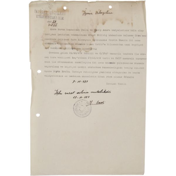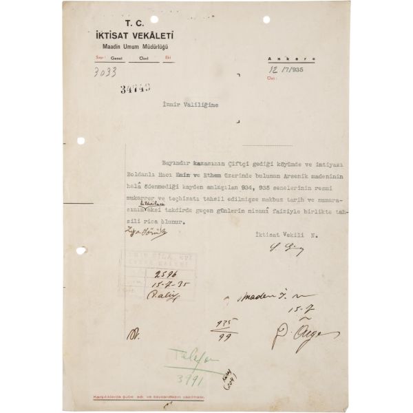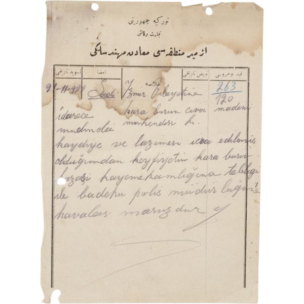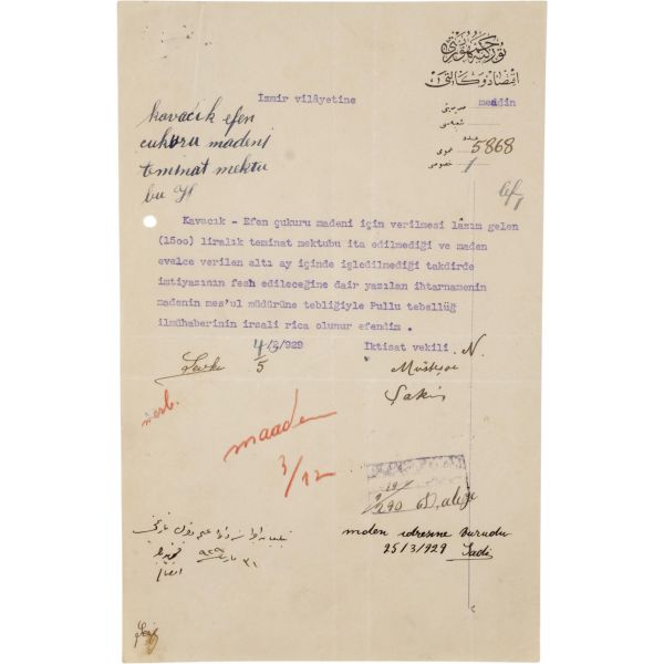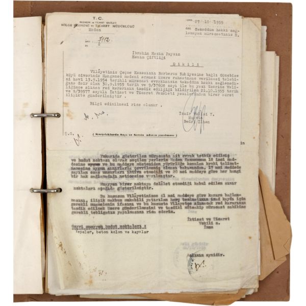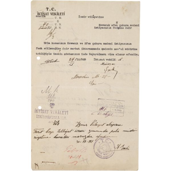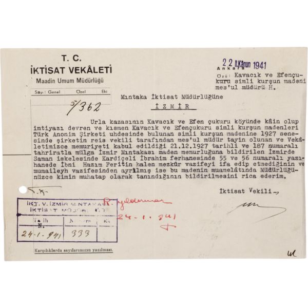 Madenler hakkında kaleme alınmış olan ilk evrak 18 Nisan 1329 tarihli, Hıfzı Paşa´ya %40, Atanaşula Efendi´ye %60 hisse ile ortak imtiyaz verildiğini konu alan ferman suretidir. Cumhuriyet´in ilanından sonra Kavacık ve Efemçukuru madenlerinin işletmesi Atanaşula Efendi´den alınarak Manisalı Mehmet Tahir Efendi´ye devredilmiştir. 1927 yılından başlayarak 1942 yılına kadarki evraklarda, Türkiye Cumhuriyeti İktisat Vekaleti, İzmir Mıntıkası Maden Mühendisliği ve Karaburun Cıva Madeni antetli çok sayıda evrak ve yazışma yer almaktadır. Seydiköy zımpara madeni ile ilgili 2 adet el çizimi harita, maden şartnameleri, Alman Boğazı´nın elle çizilmiş büyük boy haritası...