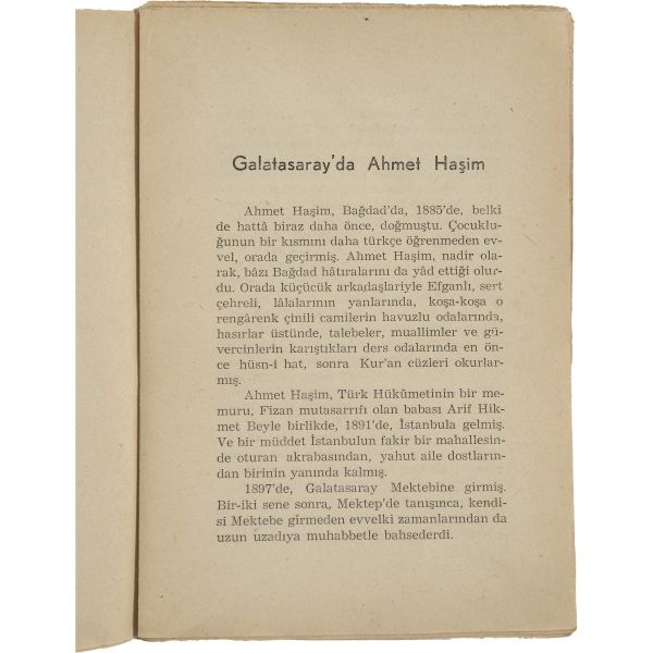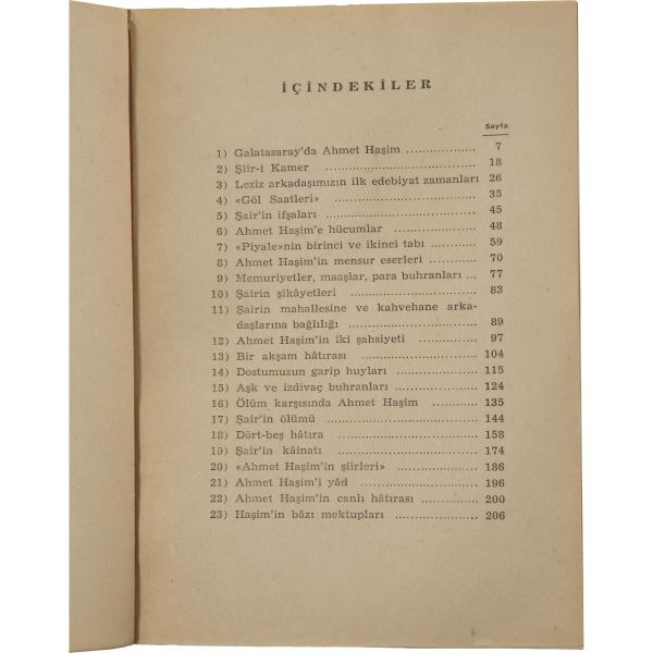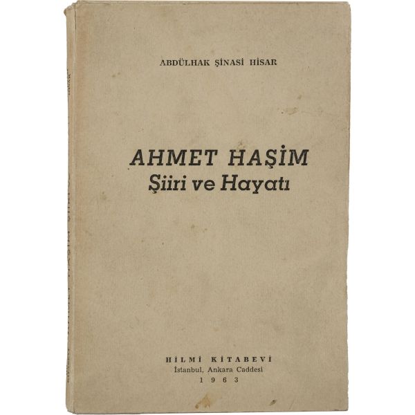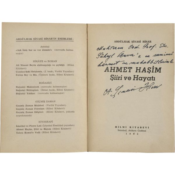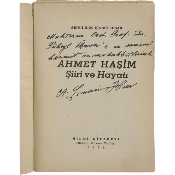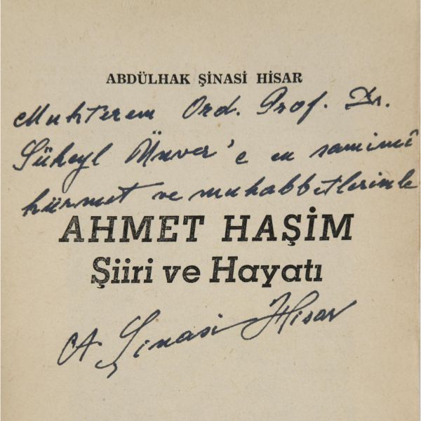 Abdülhak Şinasi Hisar'ın, yakın dostu Ahmet Haşim üzerine kaleme aldığı eseri... "Muhterem Ord. Prof. Dr. Süheyl Ünver´e en samimî hürmet ve muhabbetimle" ithafıyla imzalanmıştır.