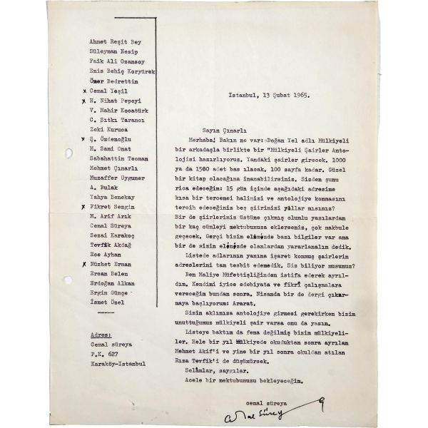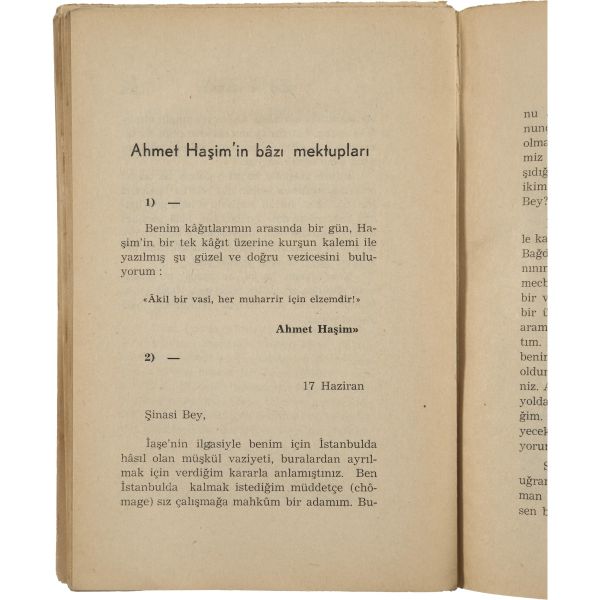 Anket cevabını lüzumundan fazla geciktirdiğimin farkındayım, fakat içinde bulunduğum vaziyeti anlatırsam beni mazur görürsün zannediyorum. Sümer Banka'da çalıştığımı biliyorsun. Tuttular beni Karabük Fabrikası'na verdiler. Tabii hemen istifamı bastım. Ne işim var orada benim. On beş gündür iş aramakla meşgulüm. Henüz bir şey de bulamadım. Gazetecilik de beni pek açmıyor. Maamafih başka iş bulamazsam son çalacağım kapı odur. Varlık'ın buradaki bütün işlerini - tashih de beraber - bana devr edebilirsen ve nüsha başına bir on lira vermek imkânına mâlik isen maalmemnuniye ve maazzarure kabul ederim. Bu husustaki mütalaanı acele bildirirsen daha fazla memnun olurum. Anket alaka ve akis uyandırmaktadır. Mektubunu bekler, selam ve sevgilerimi gönderirim kardeşim.