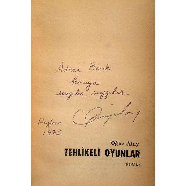 Oğuz Atay, ikinci romanı olan Tehlikeli Oyunların bu kopyasını, TRT Roman Ödülü jüri başkanı olarak Tutunamayanlar'ın bu ödülü kazanmasında çok büyük bir rolü olan eleştirmen Adnan Benk için "Adnan Berk hocaya sevgiler, saygılar" ithafıyla imzalamıştır. *Kapağında küçük bir parça kopmuştur ve sırtı restore edilmiştir.