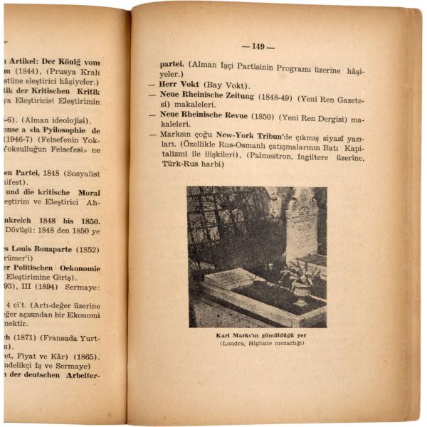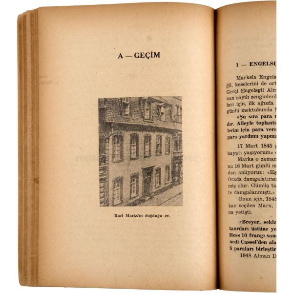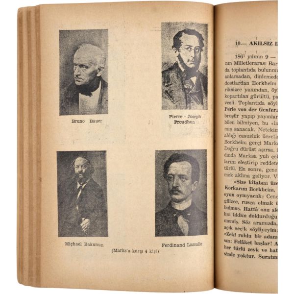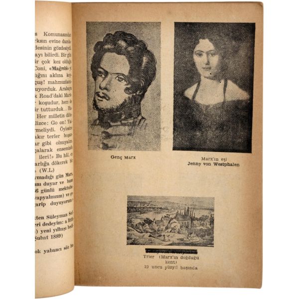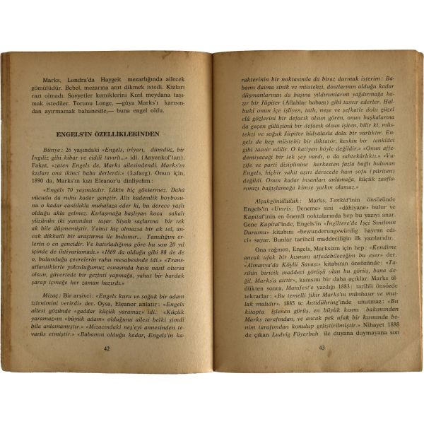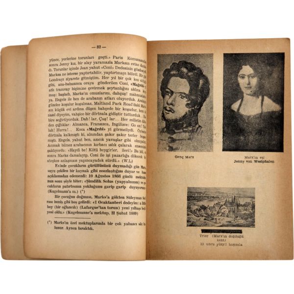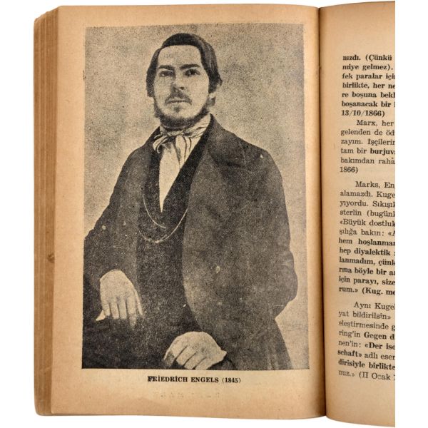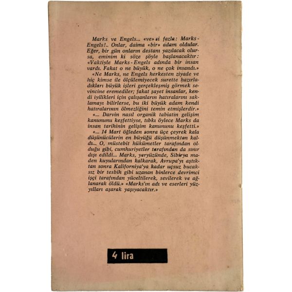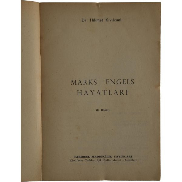Türkiye sosyalist sol tarihinin, ömrünün üçte birini hapislerde geçirmiş, en dirençli, en inatçı ve en üretken kalemi Doktor Hikmet Kıvılcımlı´dan Marks ve Engels´in kısa biyografileri... "Sevgi Saygı değer Prof. Dr. İsmet Sungurbey´e" ithafıyla 9 Ocak 1971 tarihinde imzalanmıştır.