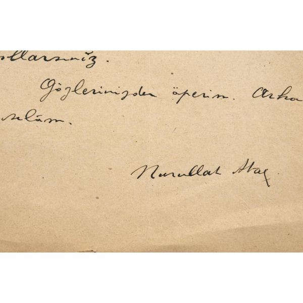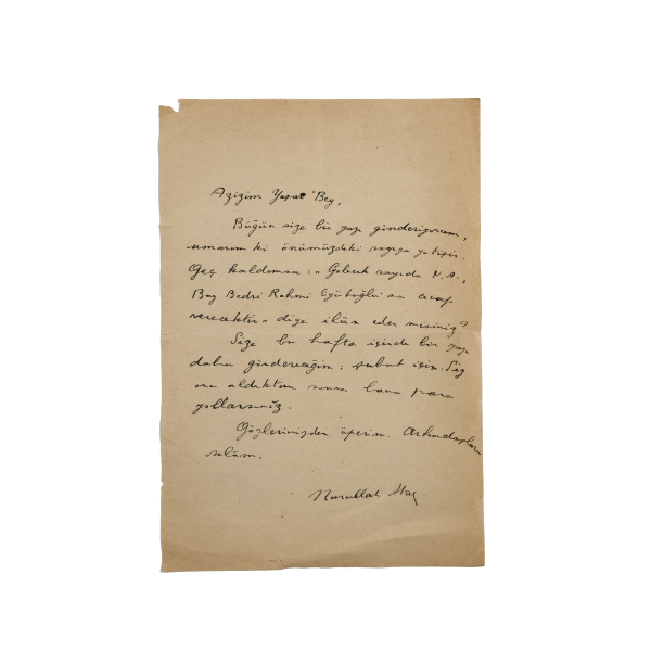 "Bugün size bir yazı gönderiyorum, umarım ki önümüzdeki sayıya yetişir. Geç kaldımsa "N.A Bay Bedri Rahmi Eyüboğlu'na cevap verecektir." diye ilan eder misiniz? Size bu hafta içinde bir yazı daha göndereceğim. Siz onu aldıktan sonra bana para yollayınız. Gözlerinizden öperim. Arkadaşlara selam."